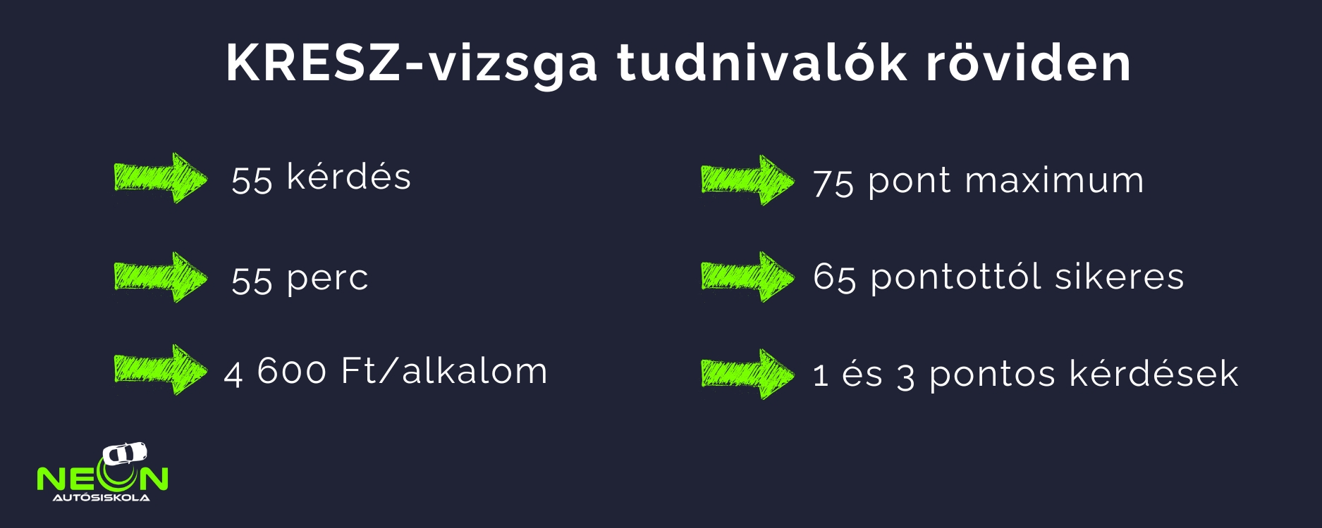 A KRESZ-vizsgán 55 kérdést kapsz, és 55 perced van válaszolni rájuk. Maximum 75 pontot szerezhetsz, és legalább 65 pontot kell elérned a sikeres vizsgához. Egyes kérdések nehézségüktől függően 1 vagy 3 pontot érnek.